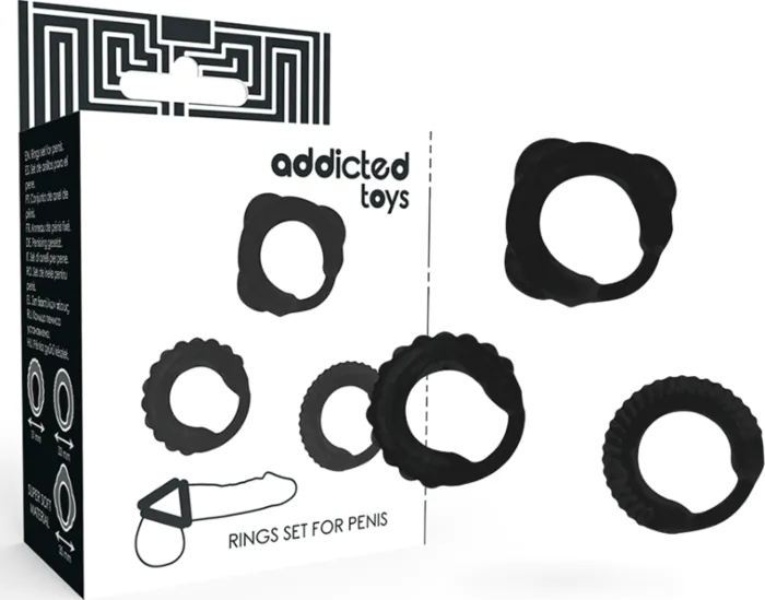 Transforma tus experiencias íntimas con el set de 3 anneaus de pene de ADDICTED TOYS. Diseñados para proporcionar firmeza y control, son prácticos para quienes buscan mejorar su rendimiento.