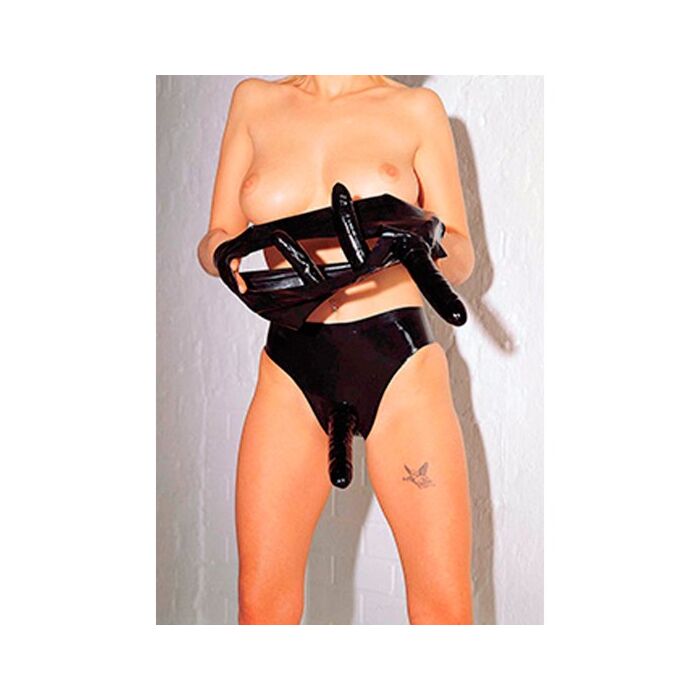 Fantástico arnés con triple pene para mujeres de látex en color negro, de la prestigiosa colección SHARON SLOANE Latex Collection.