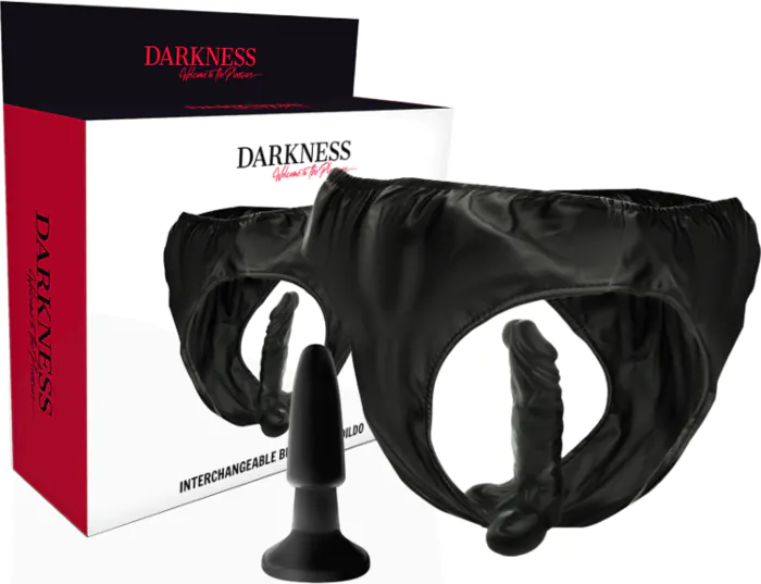 Découvrez le jeu de domination avec les culottes en cuir PU de DARKNESS. Avec un plug et un dildo interchangeables, c'est pour ceux qui recherchent de la variété dans leurs jeux érotiques.