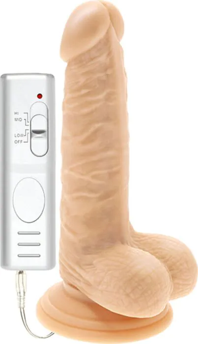 Dildo vibrant réaliste en PVC, avec testicules, ventouse très adhérente et télécommande filaire à 3 vitesses. Longueur insertable confortable (13 cm) et suffisamment ferme pour une pénétration contrôlée. Parfait si tu veux un sextoy réaliste utilisable en mode mains libres ou avec harnais; pratique, sans ports à recharger (fonctionne avec 3 piles AA).