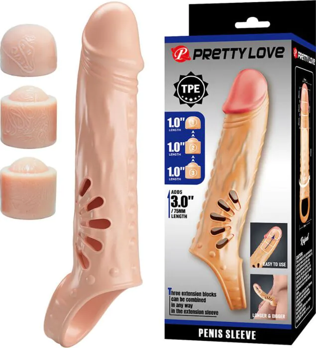 Amplification de votre plaisir avec une stimulation accrue grâce à 3 extensions amovibles. Conçue en TPE premium, cette gaine garantit confort et sensations délicates lors de la pénétration.