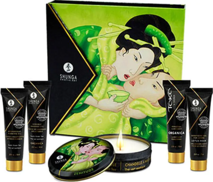 Shunga, leader mondial en cosmétique érotique, mise sur ingrédients naturels et principes actifs pour proposer ce coffret sensuel au parfum et goût thé vert — une manière raffinée et compacte d'aborder la cosmétique érotique en couple.