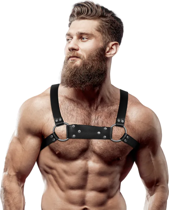 Ce harnais en cuir écologique met en valeur votre silhouette masculine tout en offrant un ajustement confortable. Unique pour ceux qui veulent se démarquer.