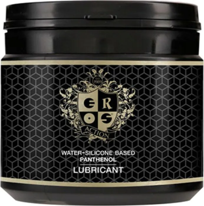 Je te présente le Eros Action: un lubrifiant hybride (eau + silicone) enrichi en panthénol. Conçu pour durer plus longtemps qu'un lubrifiant purement aqueux, il offre une glisse lisse et soyeuse sans sensation grasse. Le panthénol apporte un effet hydratant et assouplissant — utile après des pratiques répétées ou pour peaux sèches. Le format pot de 500 ml est pratique si vous pratiquez en couple, pour massages longs ou fisting.