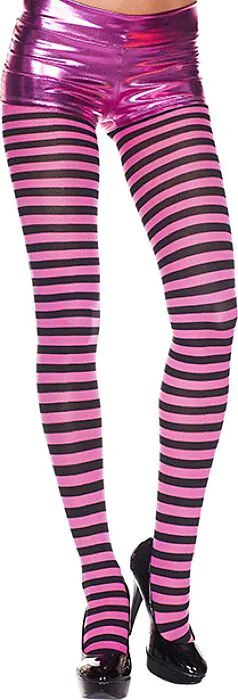 Ce sont des pantys opaques de la marque Music Legs, reconnaissables par leur fuchsia soutenu rehaussé de rayures noires. En boutique je te dirais que ce modèle est fait pour ajouter une note colorée à une tenue tout en conservant une couvrance complète : l'opacité évite toute transparence indésirable et les rayures apportent du caractère sans être criardes.