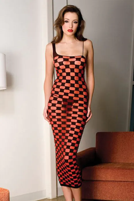 Élégante robe longue à carreaux noirs, recommandée pour une soirée ou une occasion spéciale. Sa taille distinctive s'adapte à diverses morphologies, offrant confort et style.