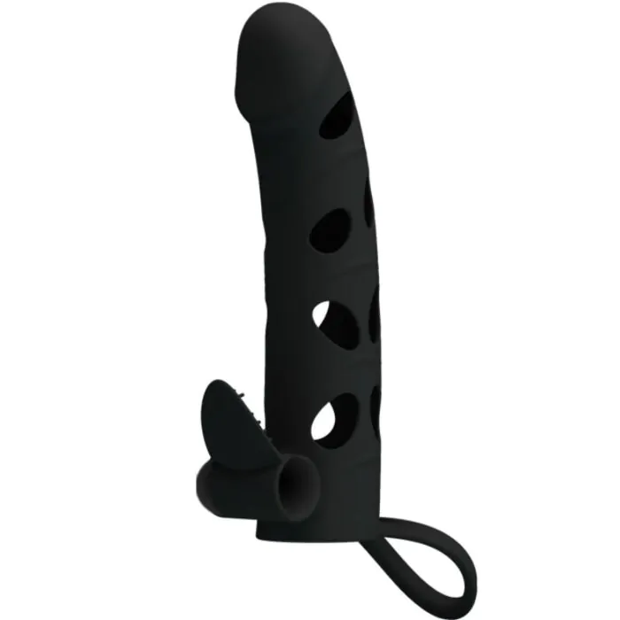 Ce manchon pénien PRETTY LOVE MALE est une housse en silicone de première qualité qui ajoute de la longueur tout en intégrant une petite vibration pour stimuler le clitoris pendant la pénétration. À la fois accessoire d'appoint et support pour prolonger l'activité sexuelle, il inclut un anneau de maintien au niveau des testicules destiné à aider à retarder l'éjaculation et stabiliser la position.