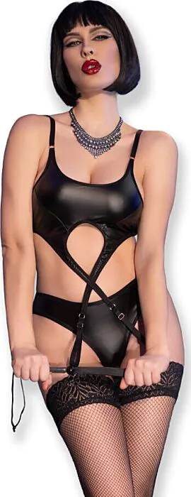 Ensemble quatre pièces qui combine une coupe coquine et une finition en cuir écologique extensible. Le top à bretelles réglables et le porte-jarretelles assurent maintien et confort, le tanga ouvert facilite l’accès, et le fouet en silicone apporte une touche ludique. Pour celles qui veulent une tenue sensuelle facile à porter, sans chercher un corset structuré.