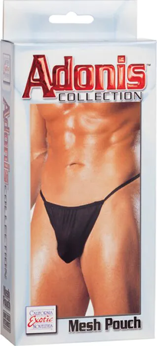 Le ADONIS - MESH POUCH de Calexotics est un tanga pour homme en mesh semi-transparent, coloris noir. En boutique je te le présenterais comme un modèle pensé pour mettre en valeur la silhouette sans ajouter de volume : le filet (mesh) est respirant, très léger et laisse deviner sans tout révéler. C'est un choix orienté séduction et confort léger plutôt qu'un sous-vêtement rembourré ou couvrant.